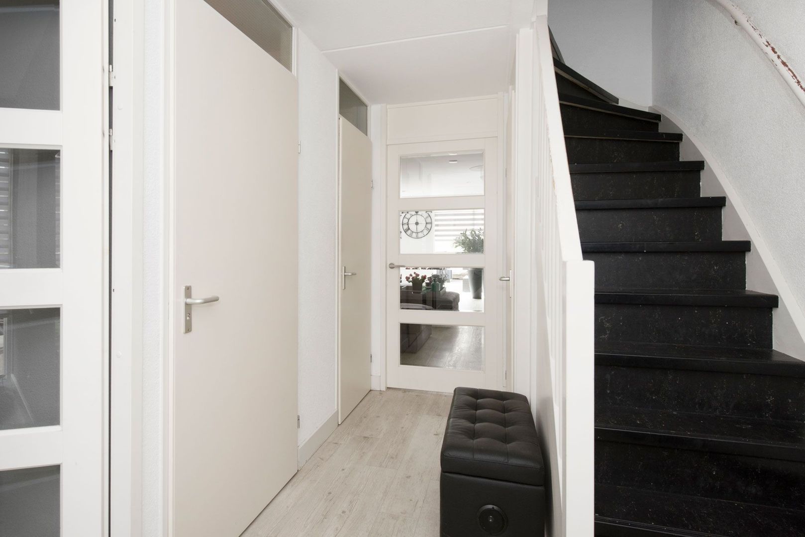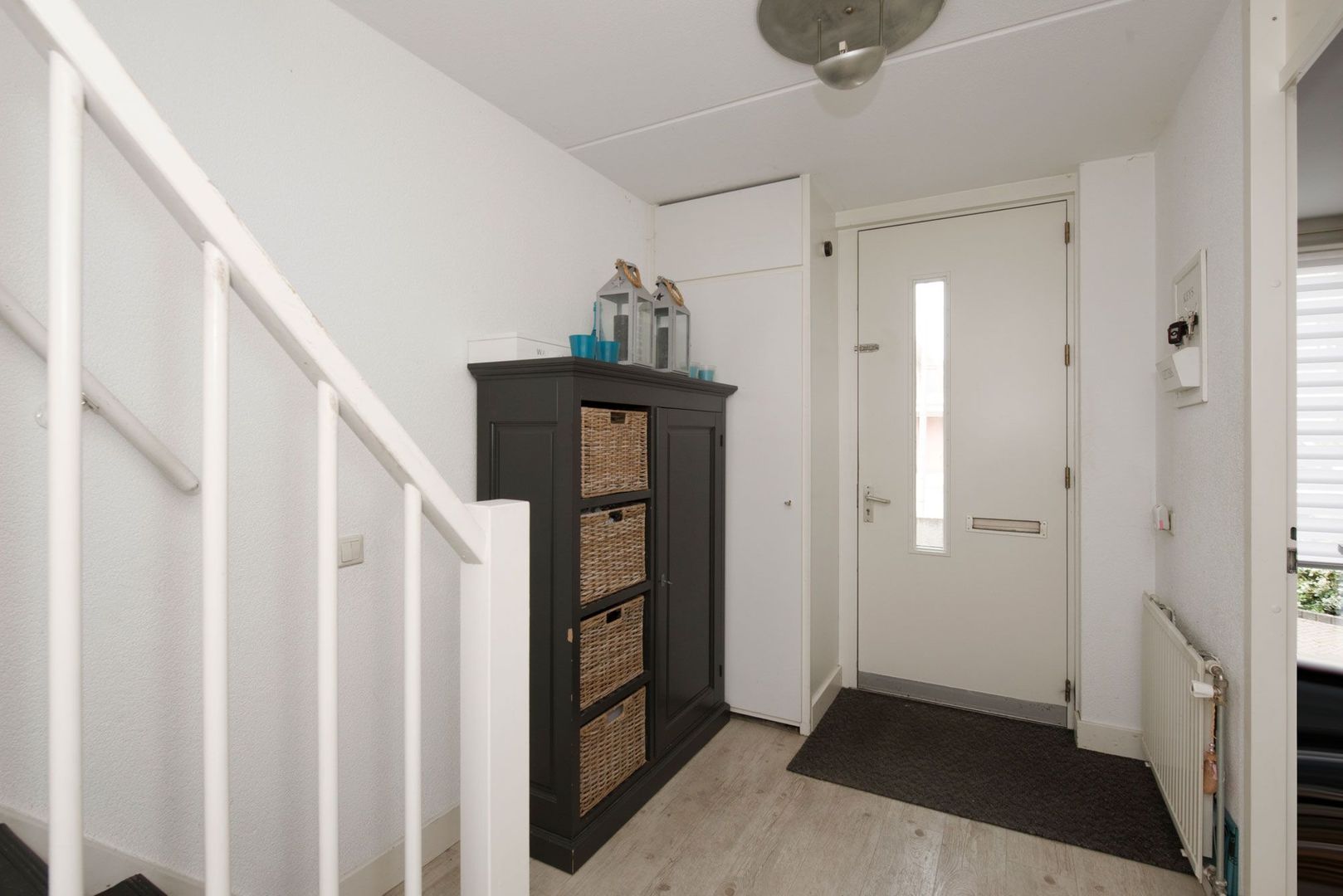 Entree met toegang naar de keuken en de woonkamer. Meterkast met voldoende groepen, geheel betegelde toiletruimte een afgesloten garderobekast en een extra trapkast.