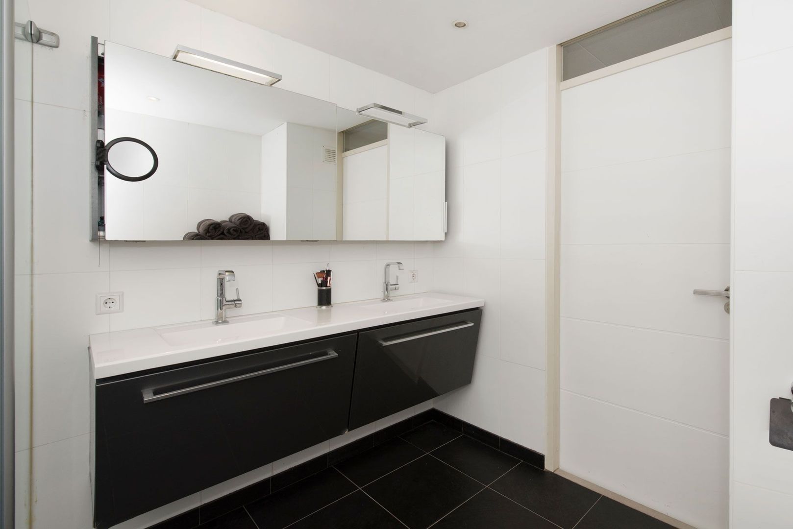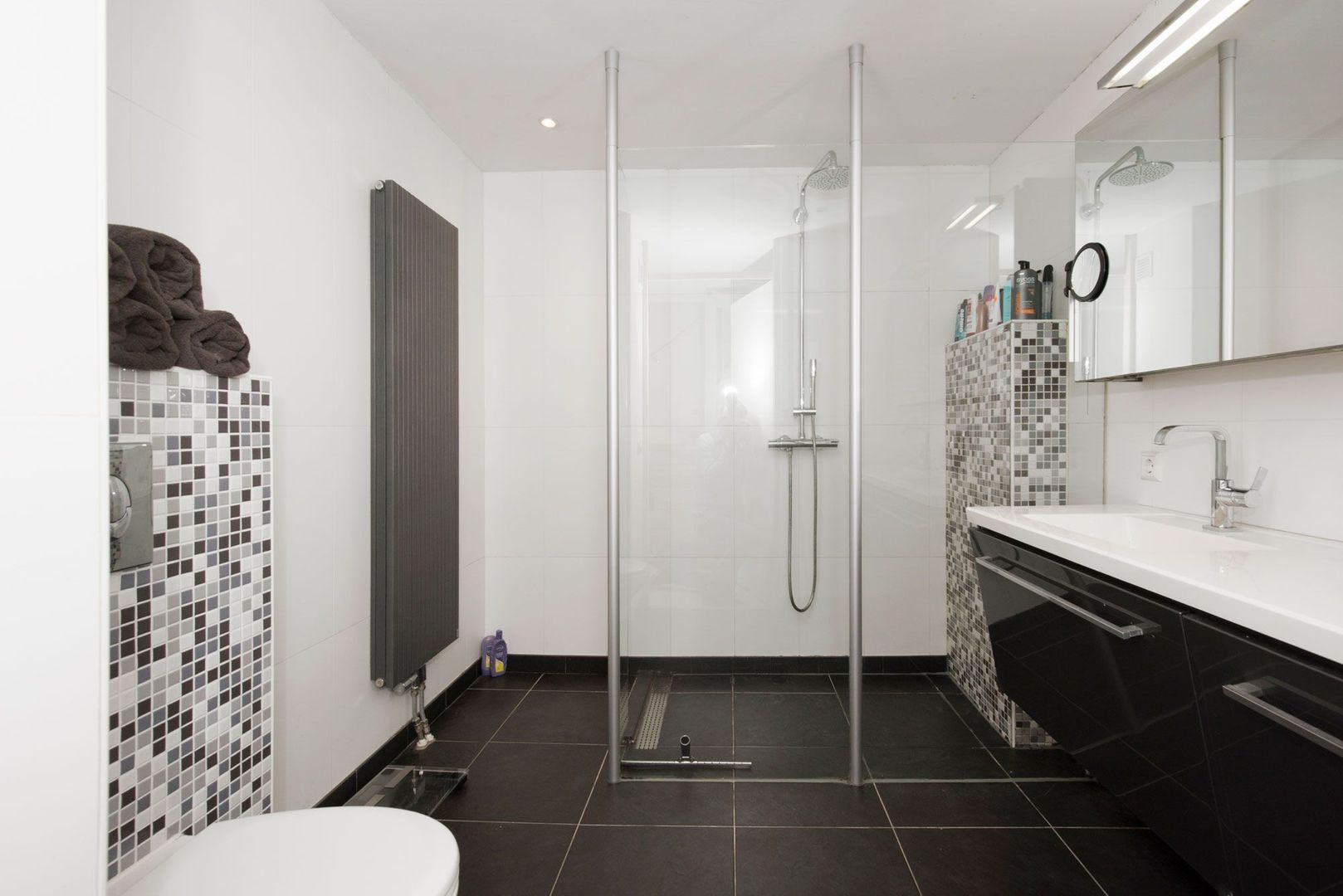 Overloop, 3 royale slaapkamers, geheel betegelde badkamer met inloop(stort)douche, grote spiegelwandkast, dubbele wastafel in meubel, 2e toilet en designradiator. De gehele verdieping is voorzien van white wash laminaat