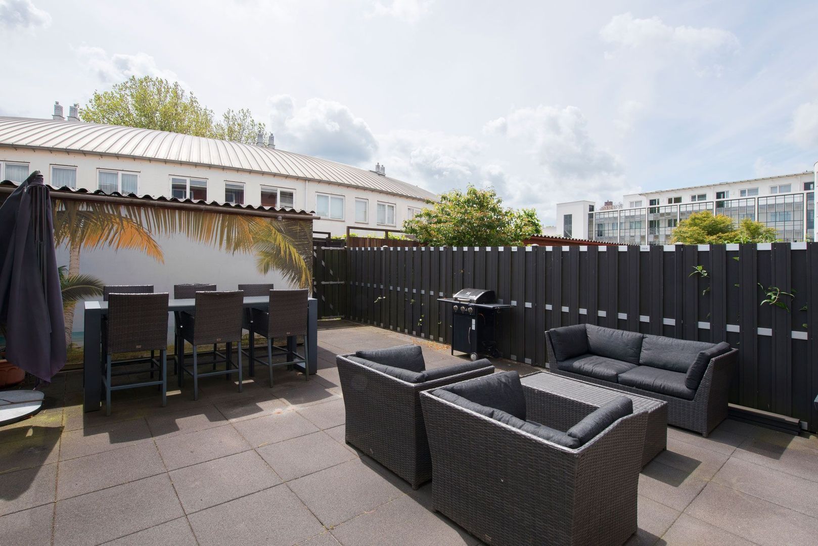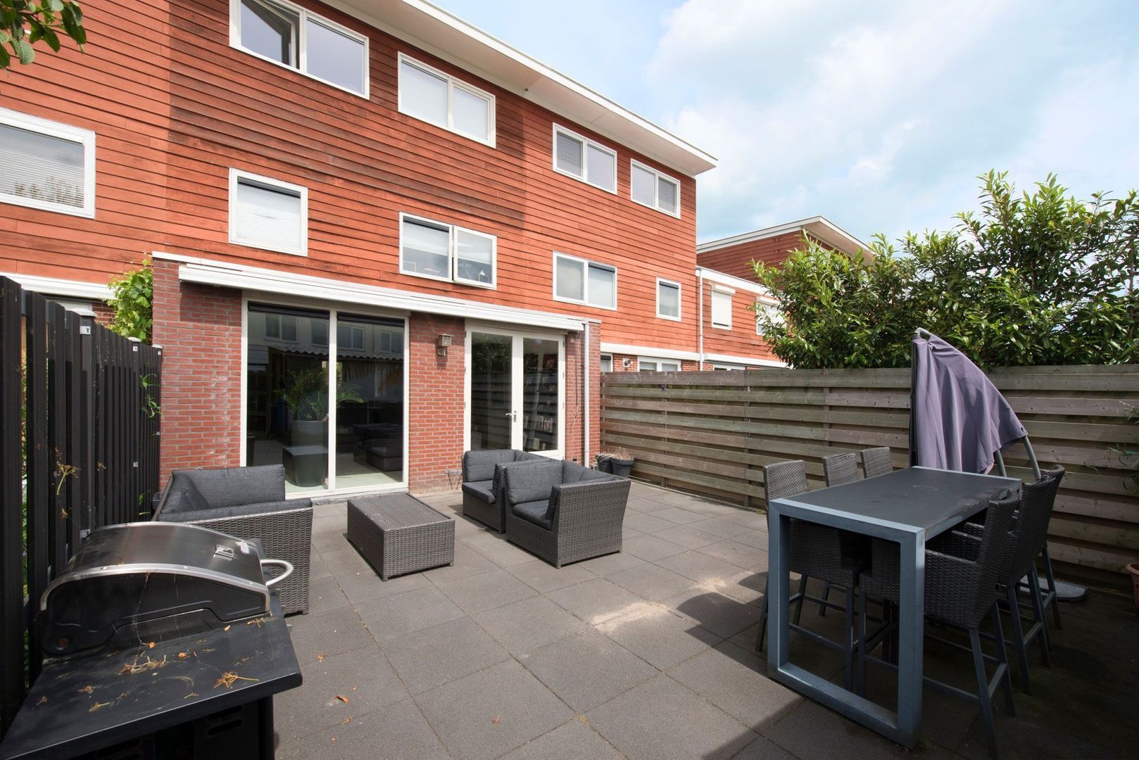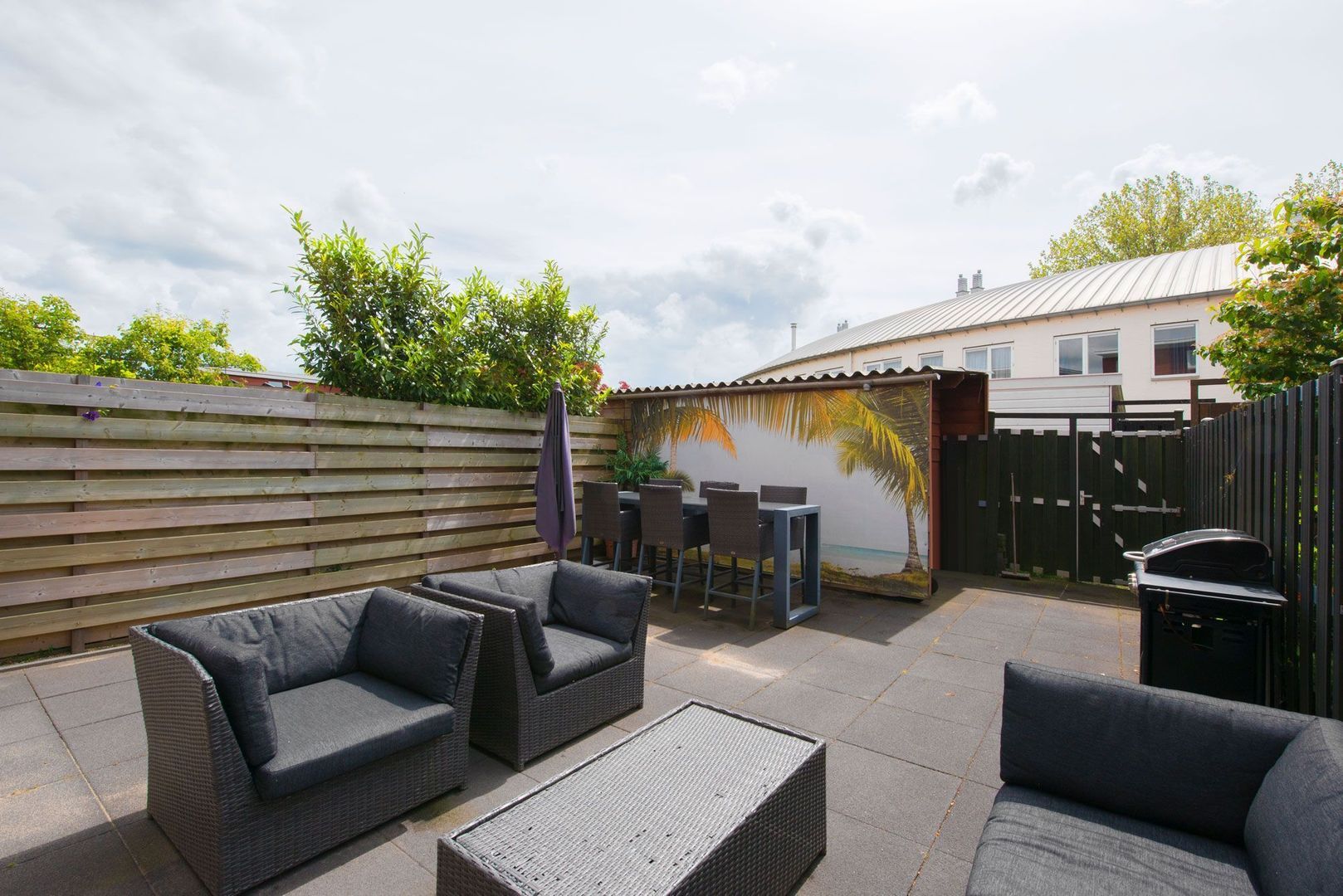 - Zonnige geheel betegelde achtertuin met houten berging en achterom