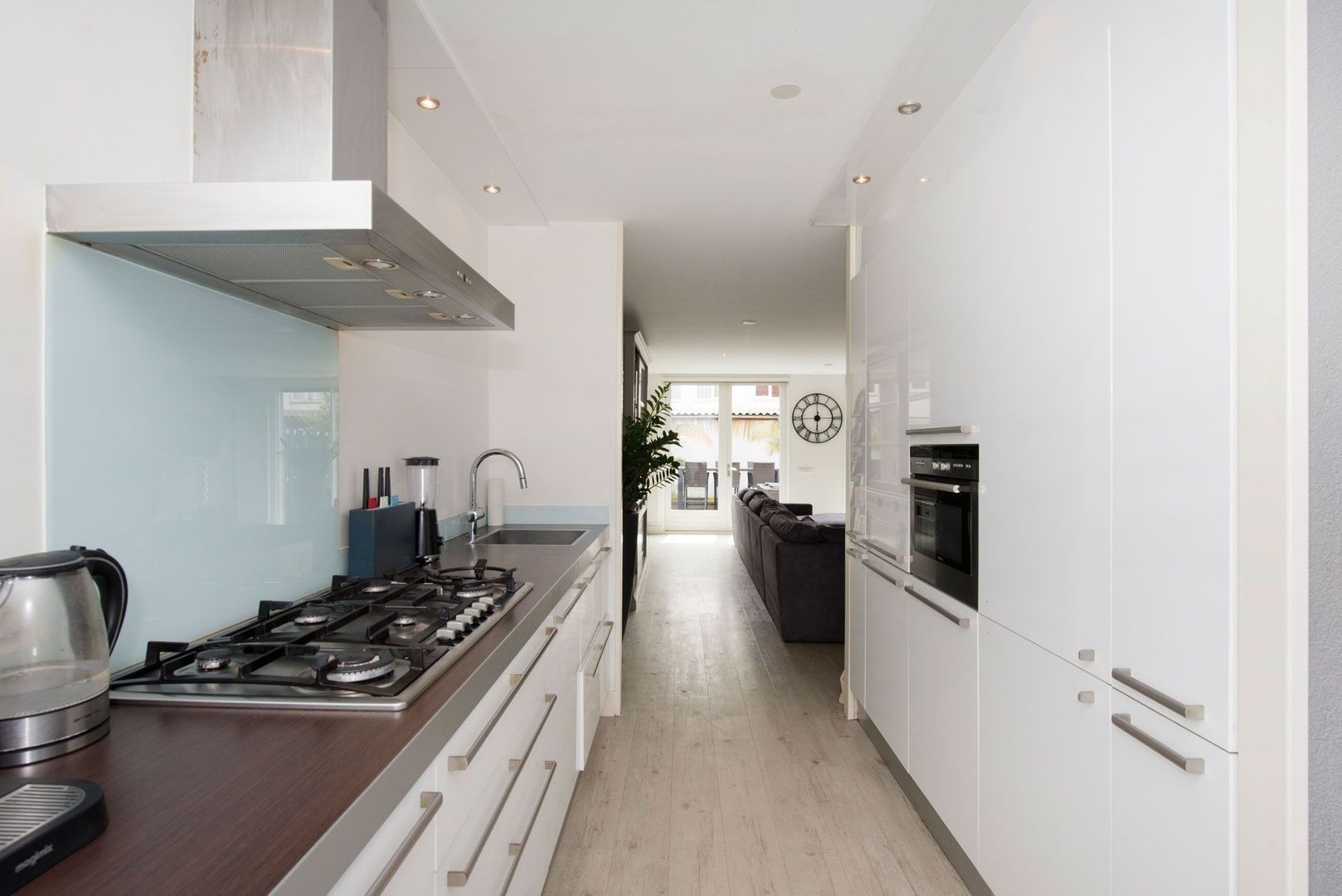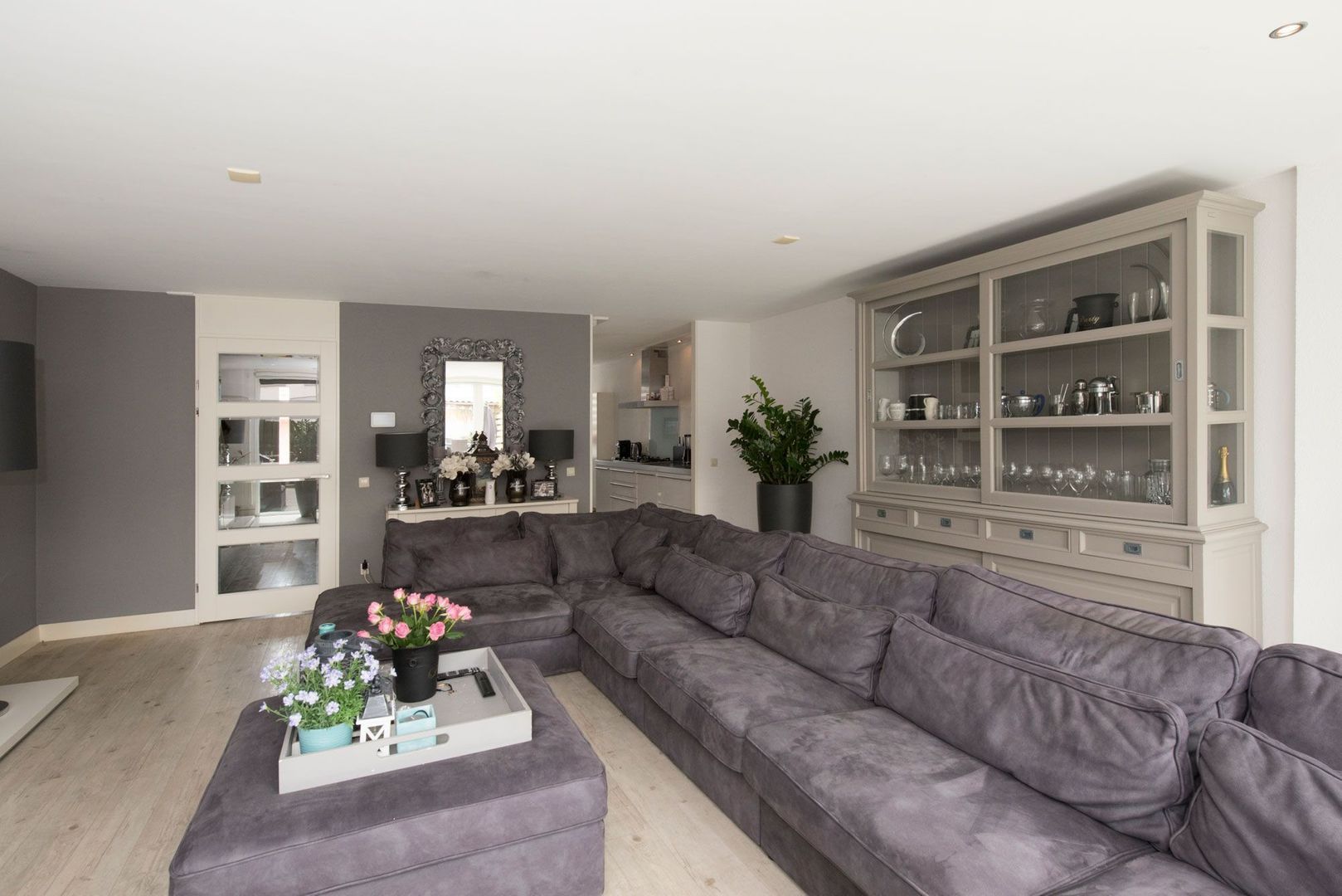 Bij binnenkomst in de living zult u versteld staan van de ruimte en de lichtinval middels de openslaande deuren en glaspartijen tot aan de grond. De keuken bevindt zich aan 2 zijden in het midden van de woning en is voorzien van diverse inbouwapparatuur zoals een 6-pits gaskookplaat, afwasautomaat, oven, grote koelkast en aparte vrieskast met 3 laden. Tevens heeft de keuken een zee aan opbergruimte door grote laden en 2 apothekerskasten.
