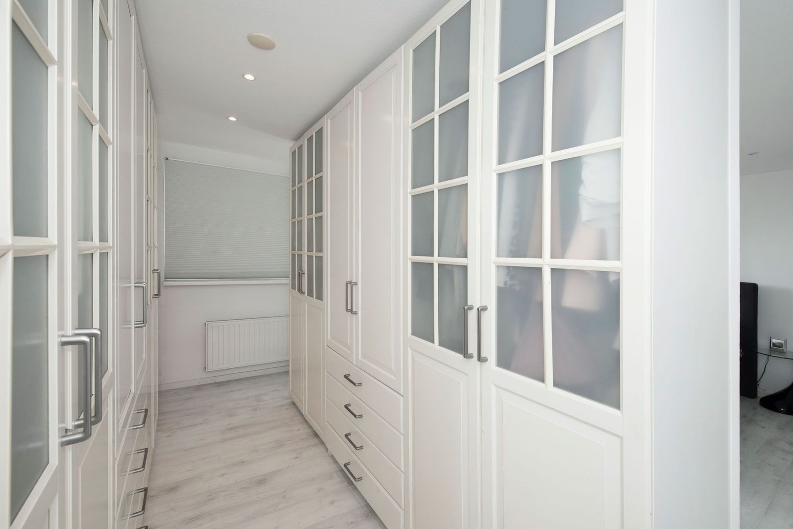 Overloop met diepe werkkast met daarin de C.V.-opstelling en de aansluiting voor de wasmachine en droger. Aan de achterzijde treft u de zeer riante master bedroom over de gehele breedte van de woning met een praktische inloopkast bereikbaar via 2 zijden.