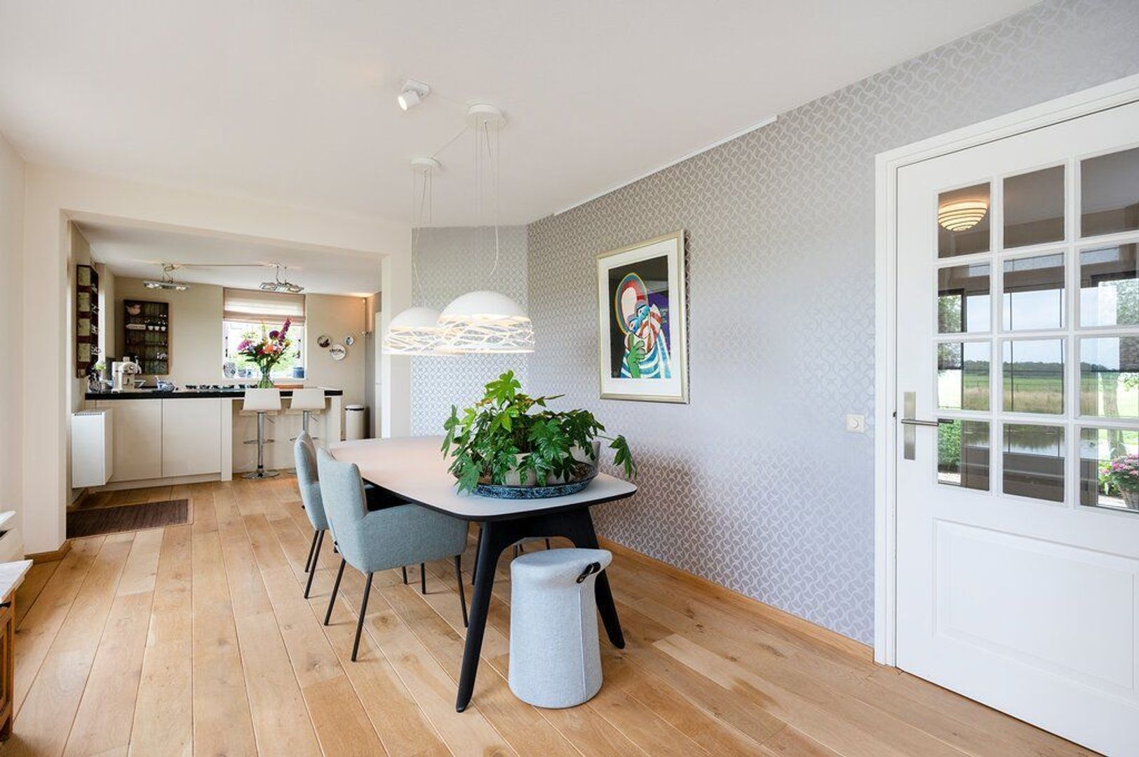 De eetkamer bevindt zich tussen de woonkamer en de keuken. Vanuit hier heeft u prachtig uitzicht over het water en het achtergelegen weiland wat reikt tot aan de Nieuwkoopse Plassen. Hier staan dagelijks koeien en schapen te grazen en is het dus ultiem genieten van de unieke locatie.