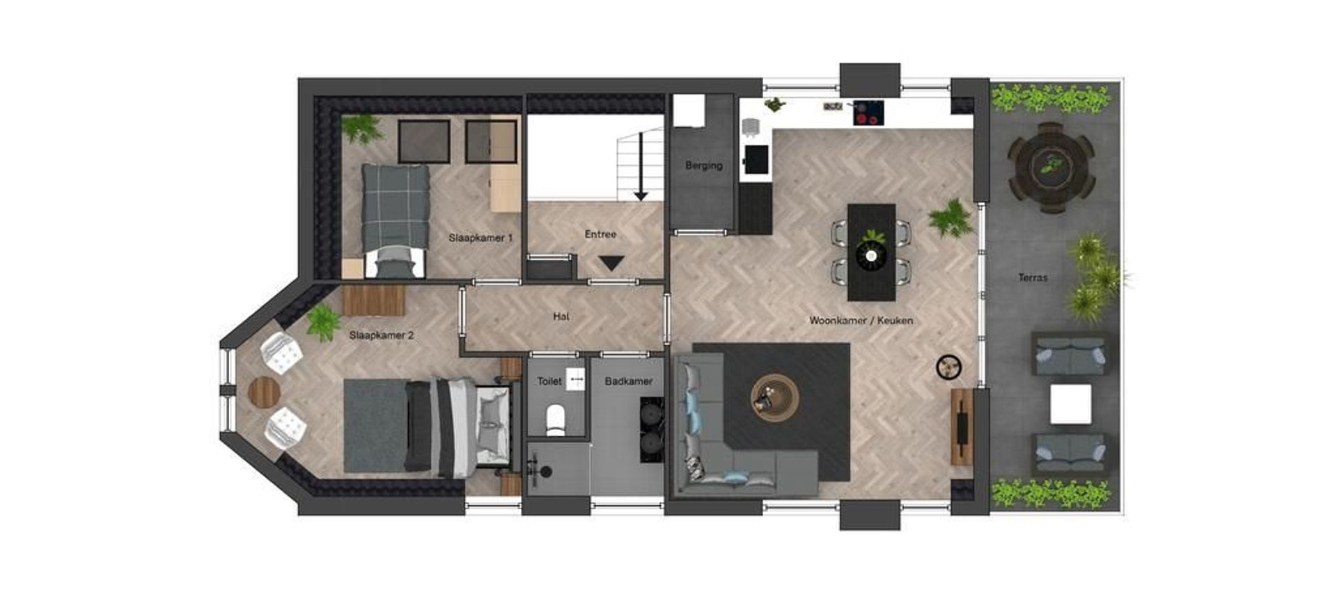 Aan de voorzijde van het appartement zijn de twee slaapkamers gesitueerd, Wederom geeft hier de kapconstructie het geheel een unieke beleving.