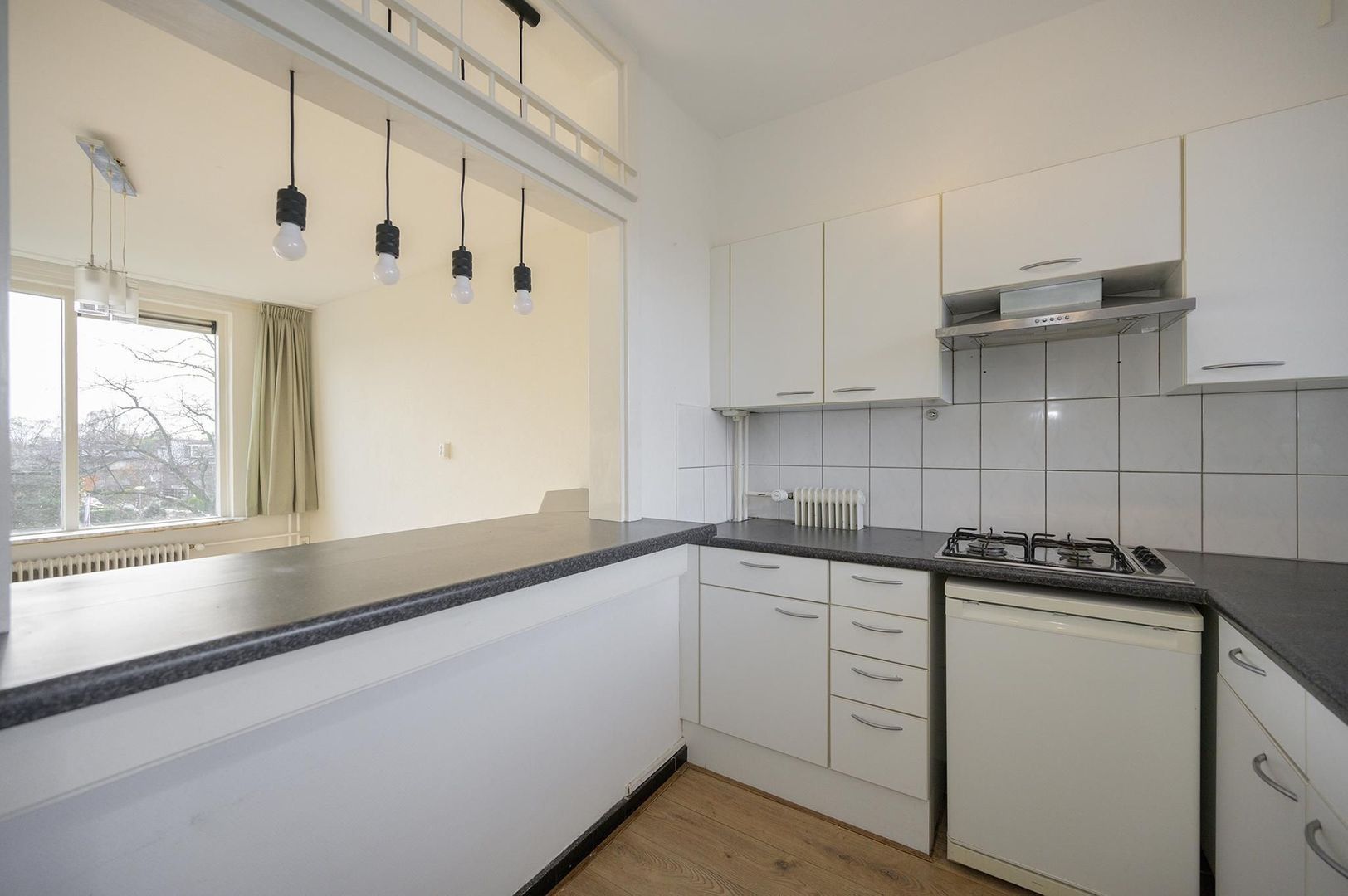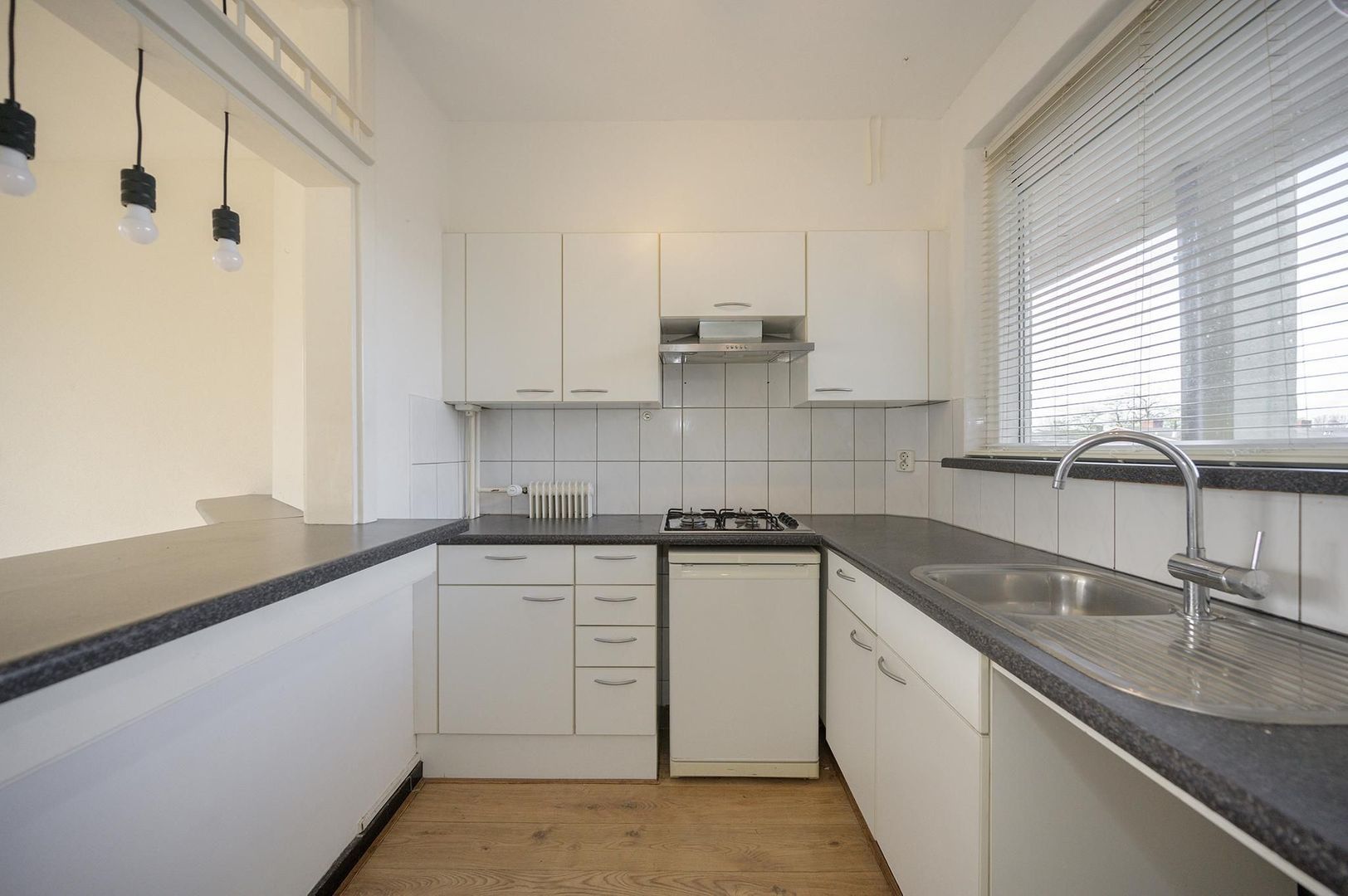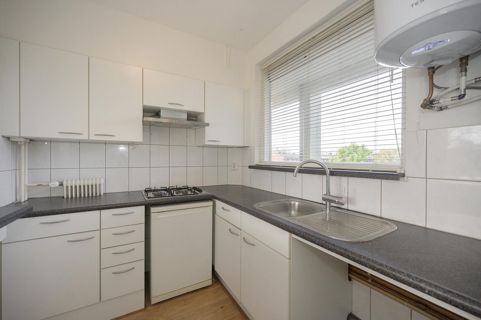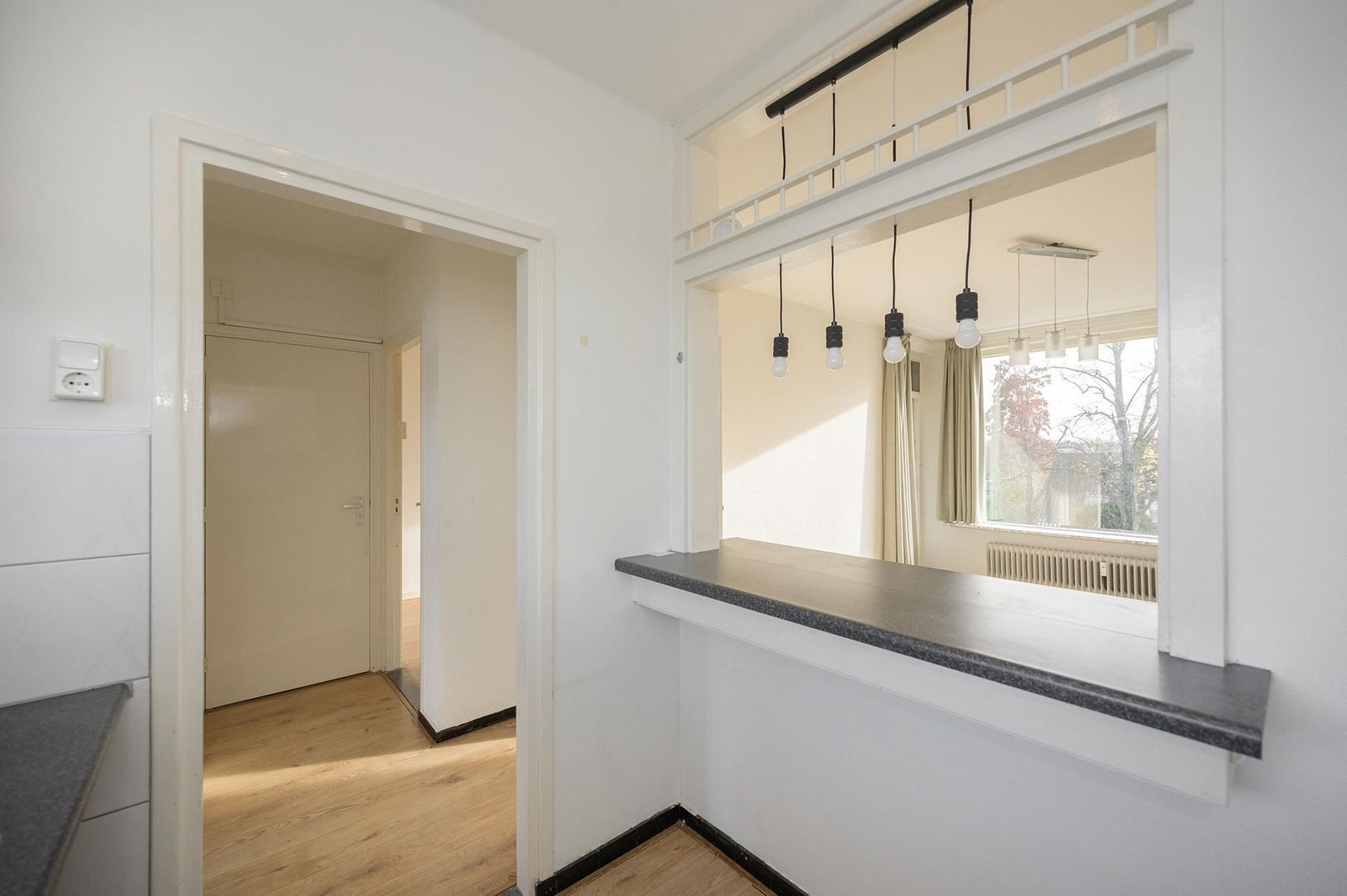 De aparte keuken is uitgerust met witte kasten, chromen handgrepen en een donker keukenblad. Voorzien van een gaskookplaat, afzuigkap, fornuis en een koel-/vriescombinatie en de elektrische boiler. Vanuit de keuken heb je vrij zicht op de groene omgeving.