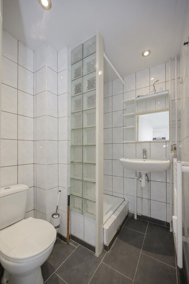De badkamer is fris en modern en voorzien van donkere vloertegels, lichte wandtegels, een wastafelmeubel, zwevend toilet, moderne radiator plus een glazen douchecabine.