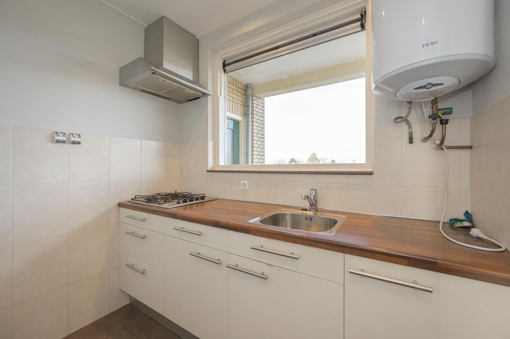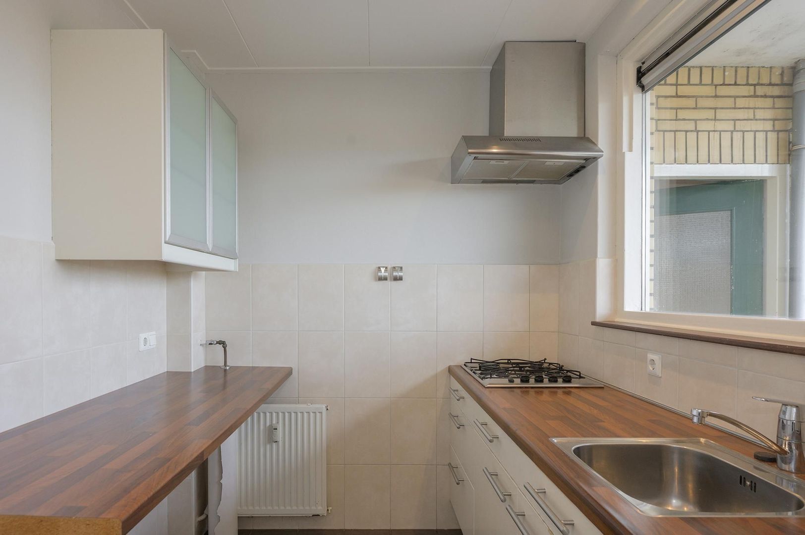 De gesloten keuken is uitgerust met lichte kasten, chromen handgrepen en houtkleurig keukenblad. Voorzien van een gaskookplaat, afzuigkap, fornuis en een koel-/vriescombinatie en de elektrische boiler. Tevens in de keuken de aansluiting voor de wasmachine en was droger. Vanuit de keuken heb je vrij zicht op de omgeving.