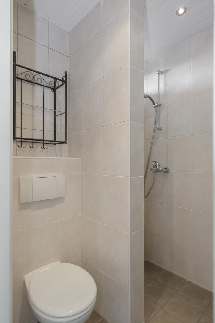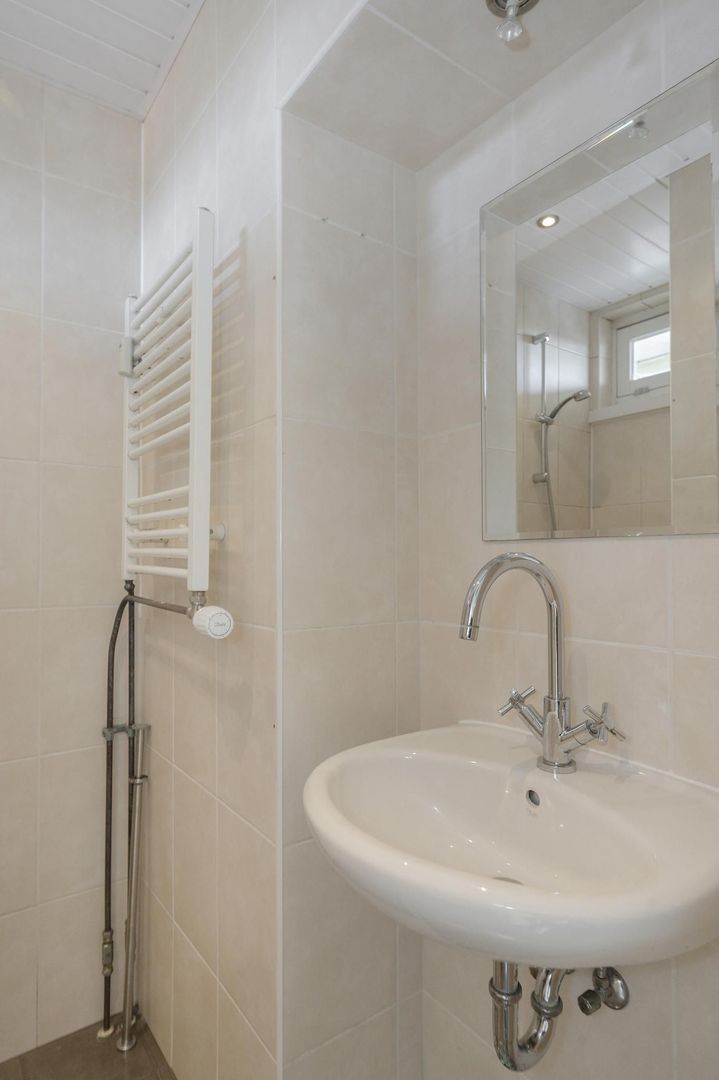 De badkamer is fris en modern en voorzien zandkleurige wandtegels, een wastafelmeubel, zwevend toilet, radiator en een inloopdouche.