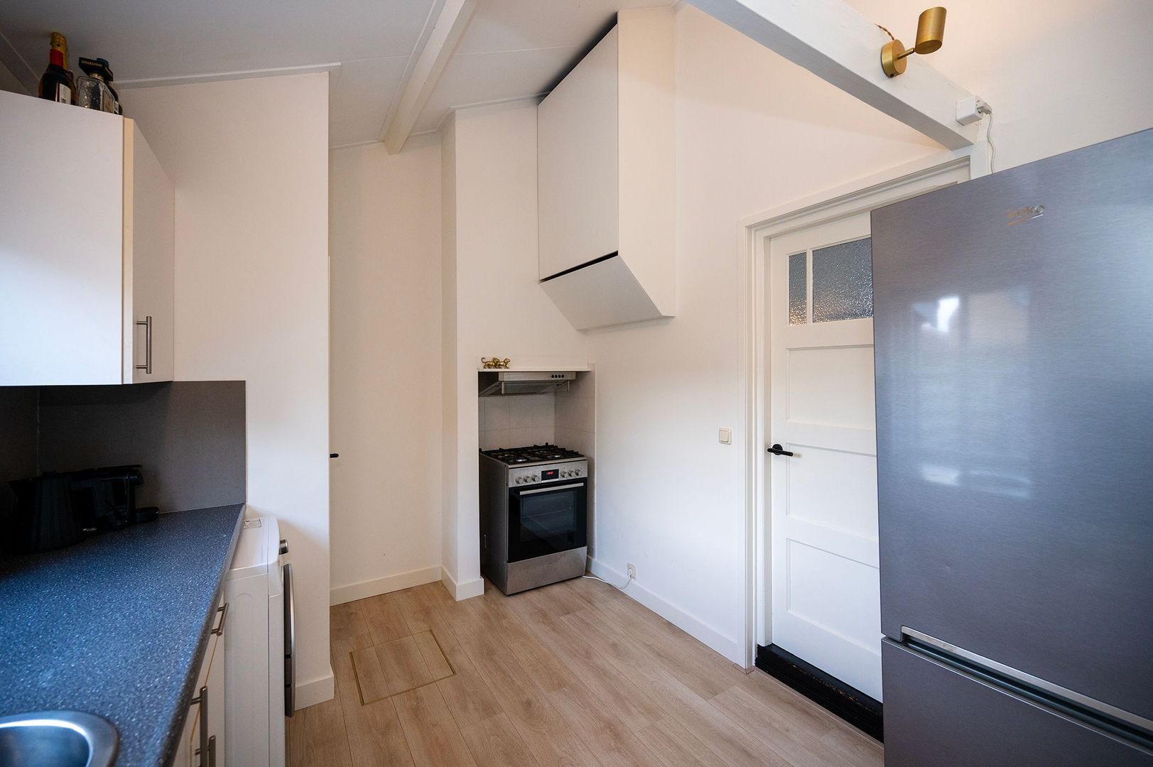 Bij binnenkomst valt meteen de praktische indeling op, links bevindt zich de keuken met een houten aanrechtblad en bijpassende spatbladen, 4 pits gaskookplaat en afzuigkap. Vanuit hier heb je een directe verbinding naar de woonkamer en de volledig betegelde badkamer, die is uitgerust met een inloopdouche, douchedeur en toilet. Recht voor je leidt de trap naar de slaapkamer.