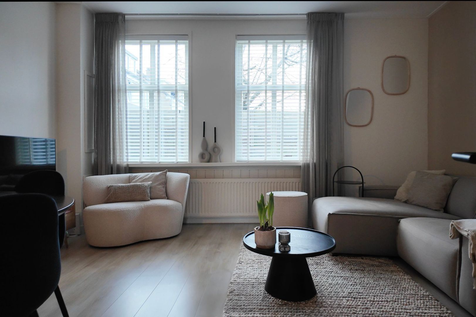 Warme, neutrale tinten en natuurlijke materialen zorgen voor een sfeer van comfort en rust. Grote ramen laten het daglicht rijk binnenstromen en maken de ruimte nog lichter en ruimtelijker.