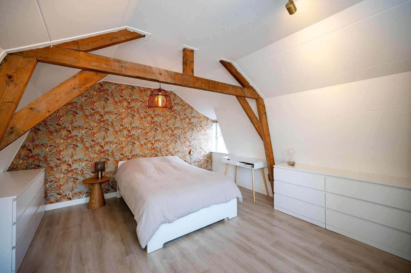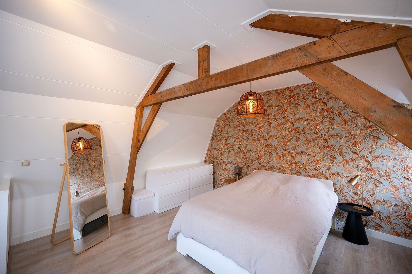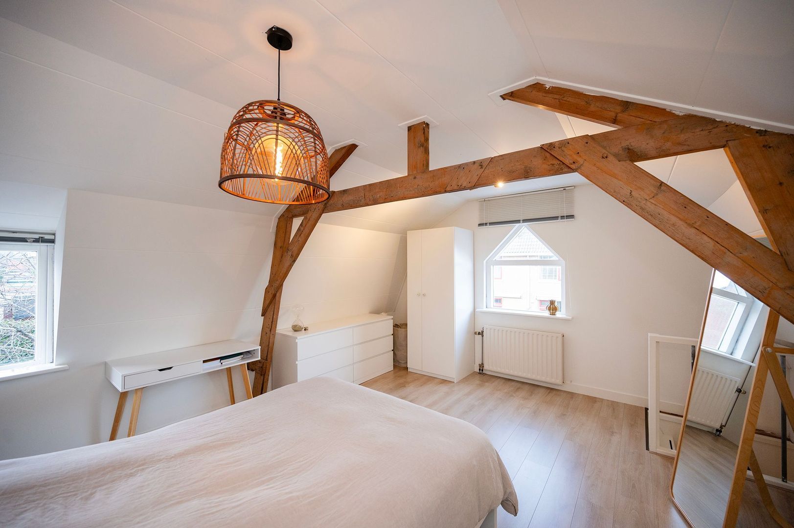 Via de trap bereikt u de 1e verdieping, waar een ruime en sfeervolle slaapkamer op u wacht. Authentieke houten balken geven de kamer karakter, terwijl de moderne afwerking voor rust en overzicht zorgt. Dankzij de twee ramen stroomt natuurlijk licht door de ruimte, waardoor de kamer open en luchtig aanvoelt. Een perfecte plek om te ontspannen.