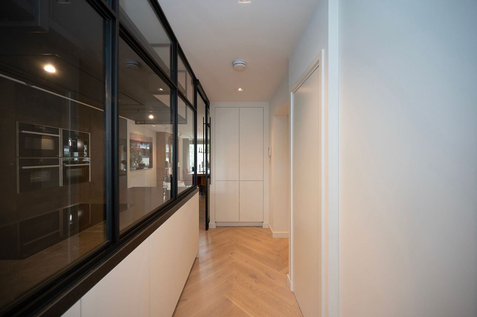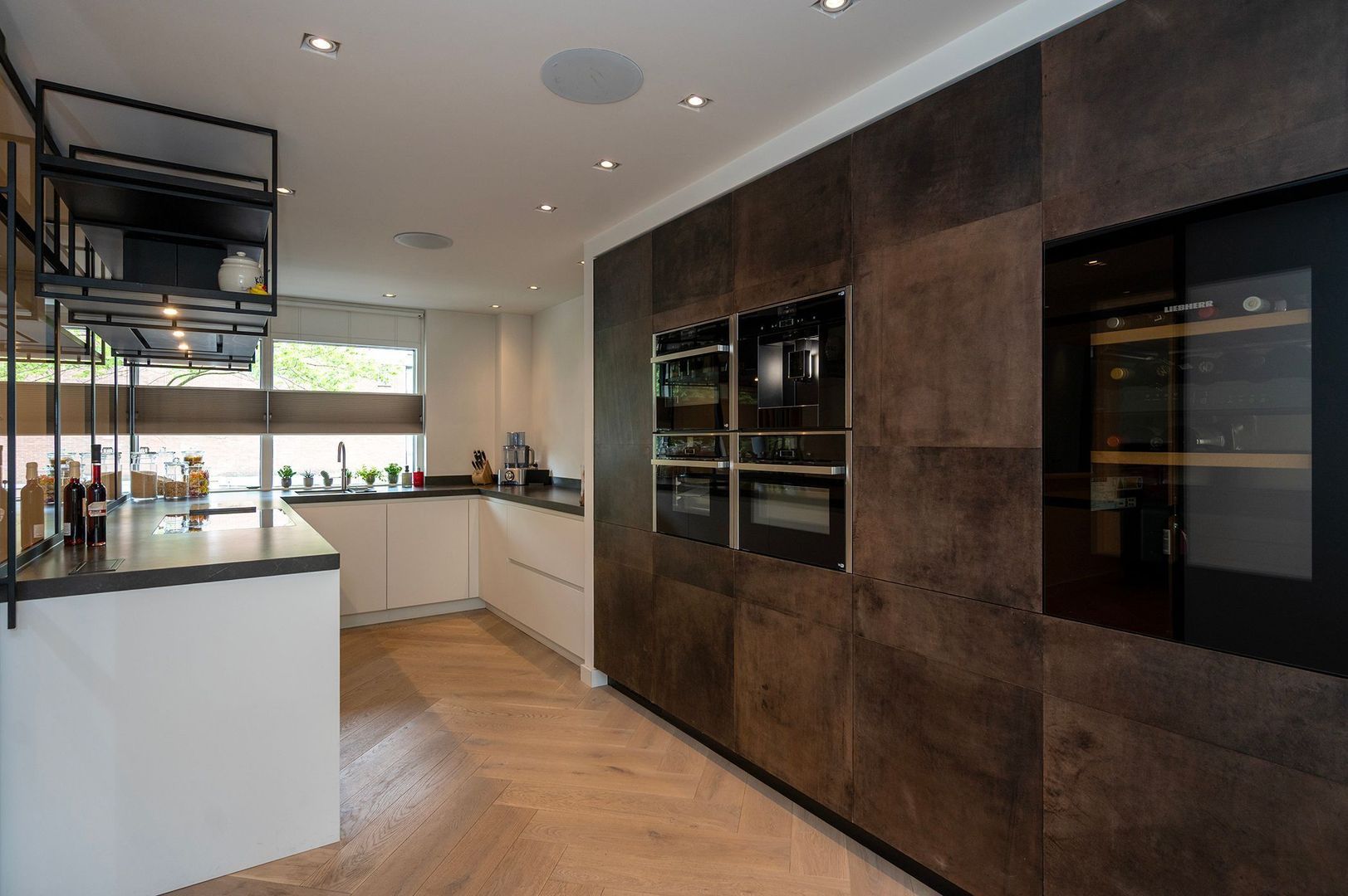 De woonkamer staat in open verbinding met de luxe keuken in U-opstelling. Deze is afgewerkt met een hoogwaardig composiet werkblad en voorzien van alle denkbare inbouwapparatuur: een 5-pits inductiekookplaat, oven, combi-oven, stoomoven, vaatwasser, koelkast, vriezer, koffiezetapparaat, wijnklimaatkast, Quooker en recirculatieafzuiging. De wandkeuken is stijlvol bekleed met buffelleer, wat een bijzonder luxe uitstraling geeft en perfect past bij het hoogwaardige karakter van de woning.