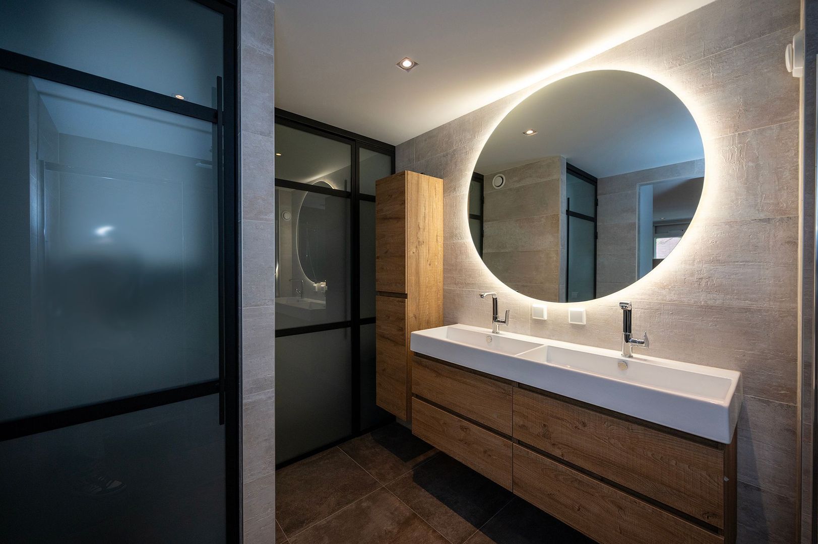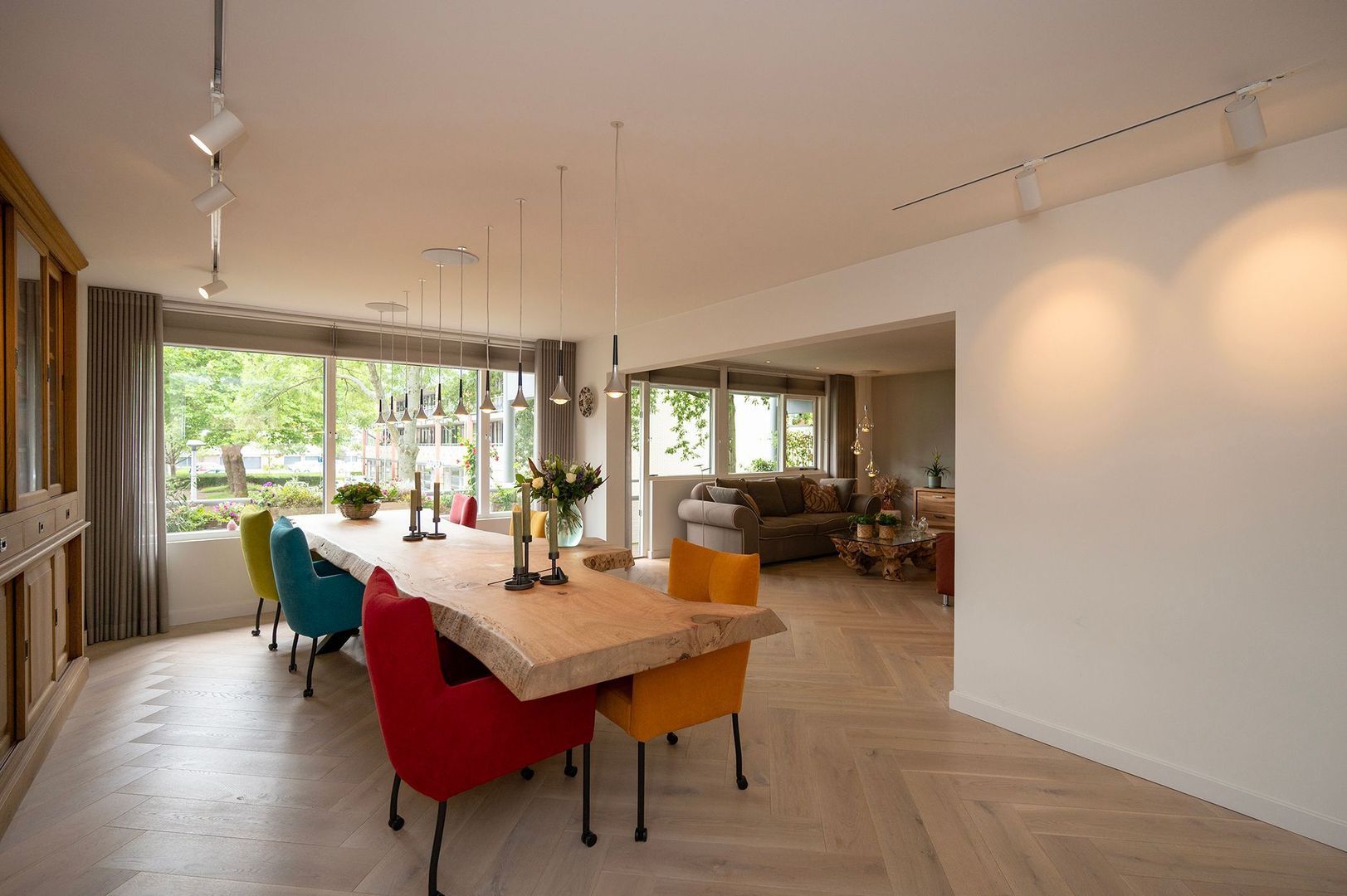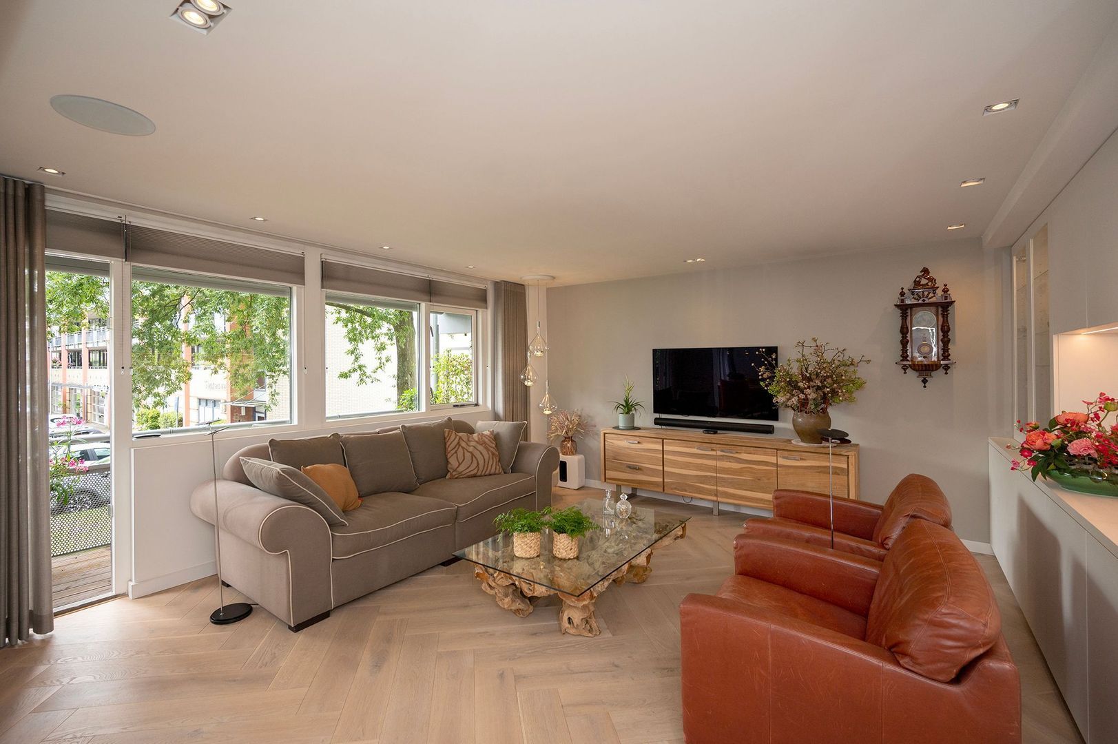 De royale woonkamer is een ware eyecatcher. Dankzij het verlaagde plafond met geïntegreerde spots en speakers ontstaat er een moderne, sfeervolle ambiance. Alles is strak gestuukt en de vloer is uitgevoerd in een visgraatmotief, gecombineerd met comfortabele vloerverwarming en ingebouwde stopcontacten op diverse locaties. Slim ontworpen inbouwkasten zorgen voor een opgeruimd en stijlvol geheel.
