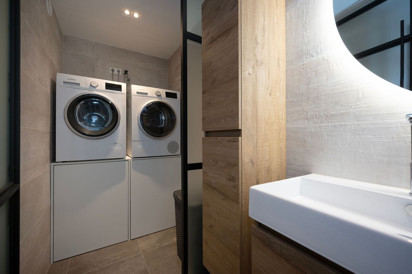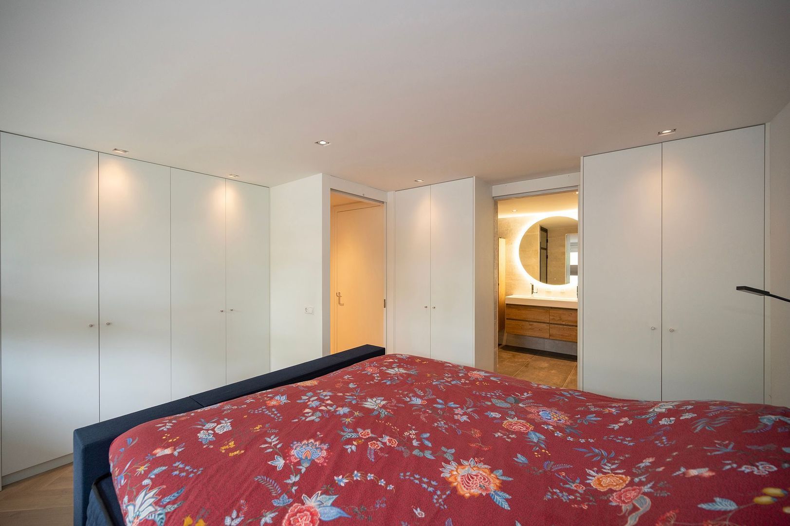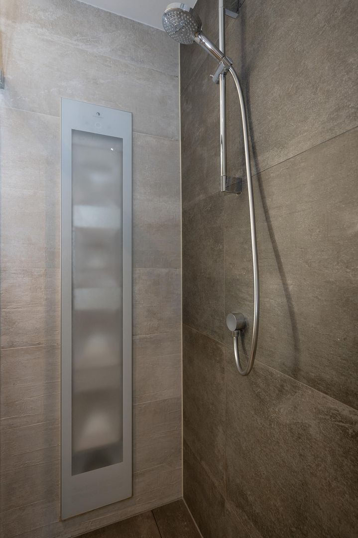 De slaapkamer is ruim en praktisch ingedeeld, met directe toegang tot de en-suite badkamer. Deze is voorzien van een inloopdouche met regendouche en geïntegreerde Sunshower, een modern wastafelmeubel en een afgesloten kast met aansluitingen voor wasmachine en droger. De elektrische boiler en verdeler van de vloerverwarming zijn hier eveneens netjes weggewerkt in een separate kast.