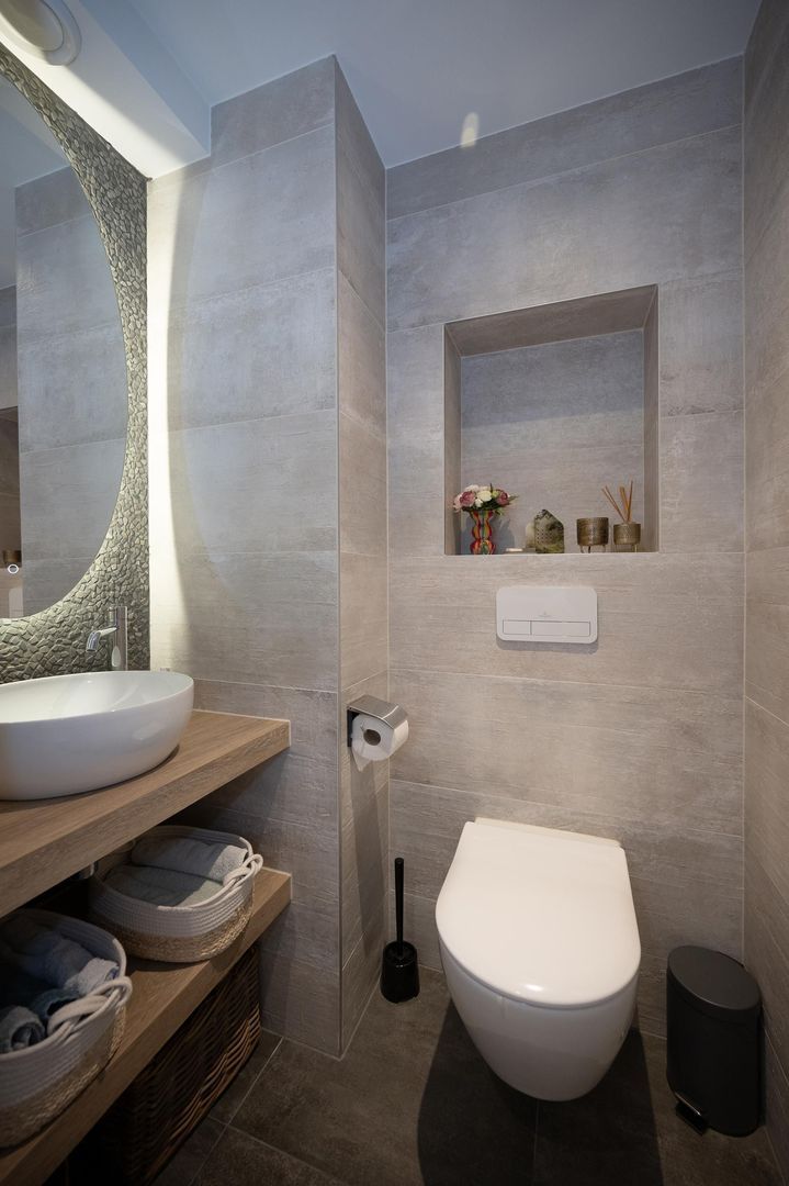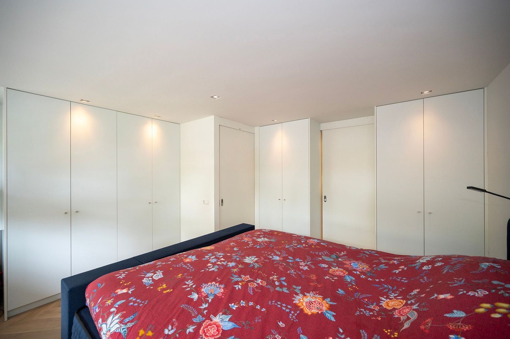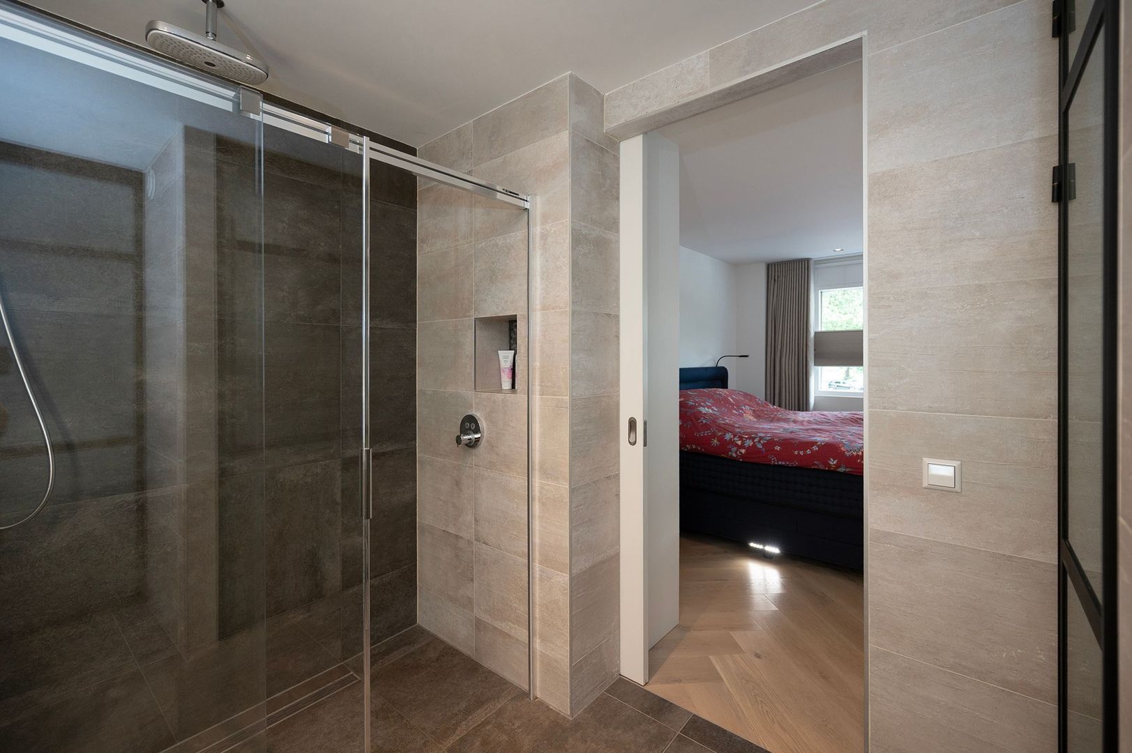 De slaapkamer is ruim en praktisch ingedeeld, met directe toegang tot de en-suite badkamer. Deze is voorzien van een inloopdouche met regendouche en geïntegreerde Sunshower, een modern wastafelmeubel en een afgesloten kast met aansluitingen voor wasmachine en droger. De elektrische boiler en verdeler van de vloerverwarming zijn hier eveneens netjes weggewerkt in een separate kast.