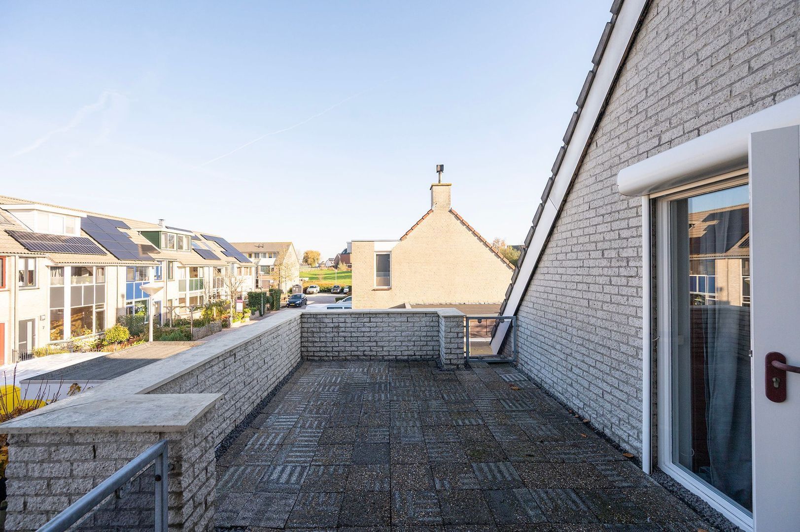 Het terras aan de zuidzijde beschikt bovendien over een vaste trap naar de achtertuin.