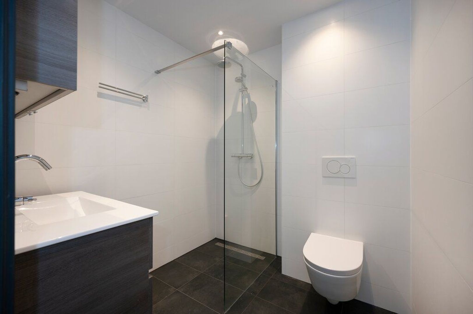 De luxe badkamer heeft een moderne uitstraling en is voorzien van een inloopdouche, hangtoilet en een wastafelmeubel. De ruimte is voorzien van een luxe wandtegel en deels strak gestuukt. Ook hier overheerst een ruimtelijk gevoel.