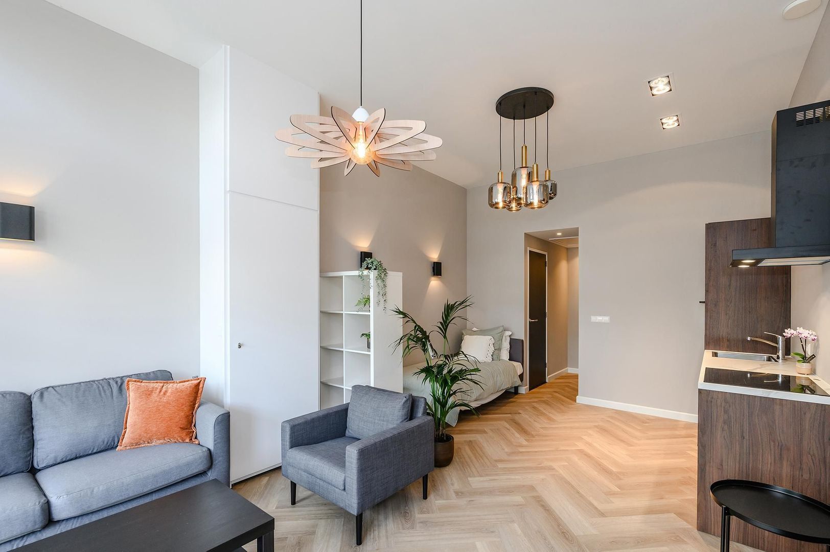 Het slaapgedeelte wordt afgescheiden van het leefgedeelte door een vakkenkast.