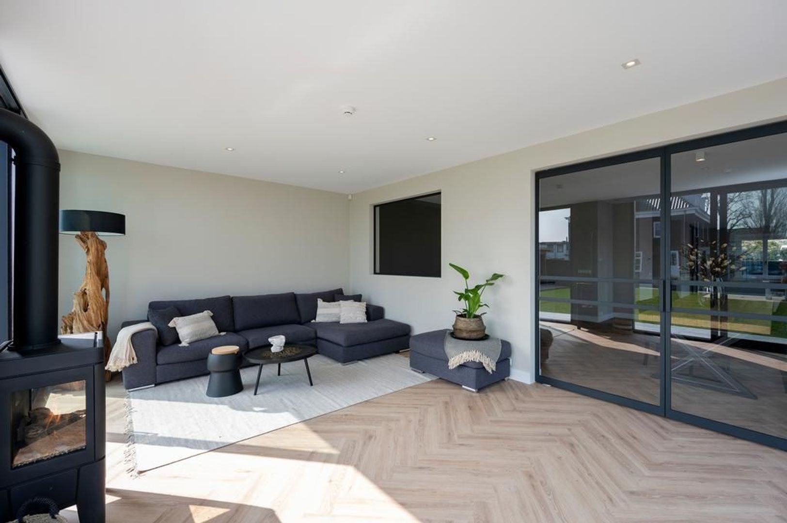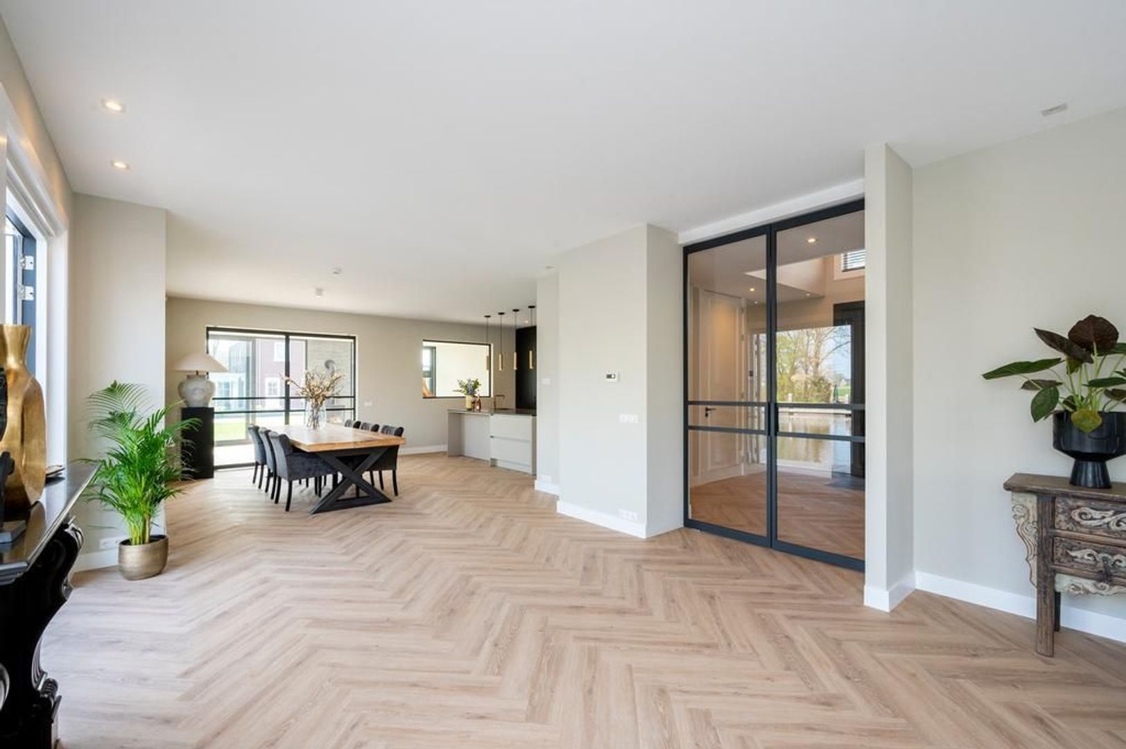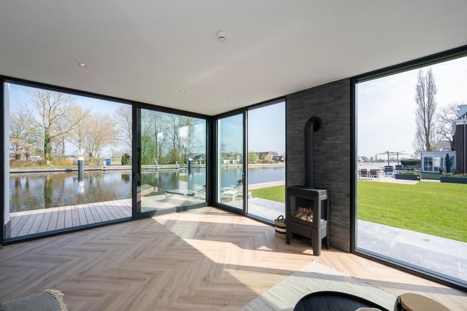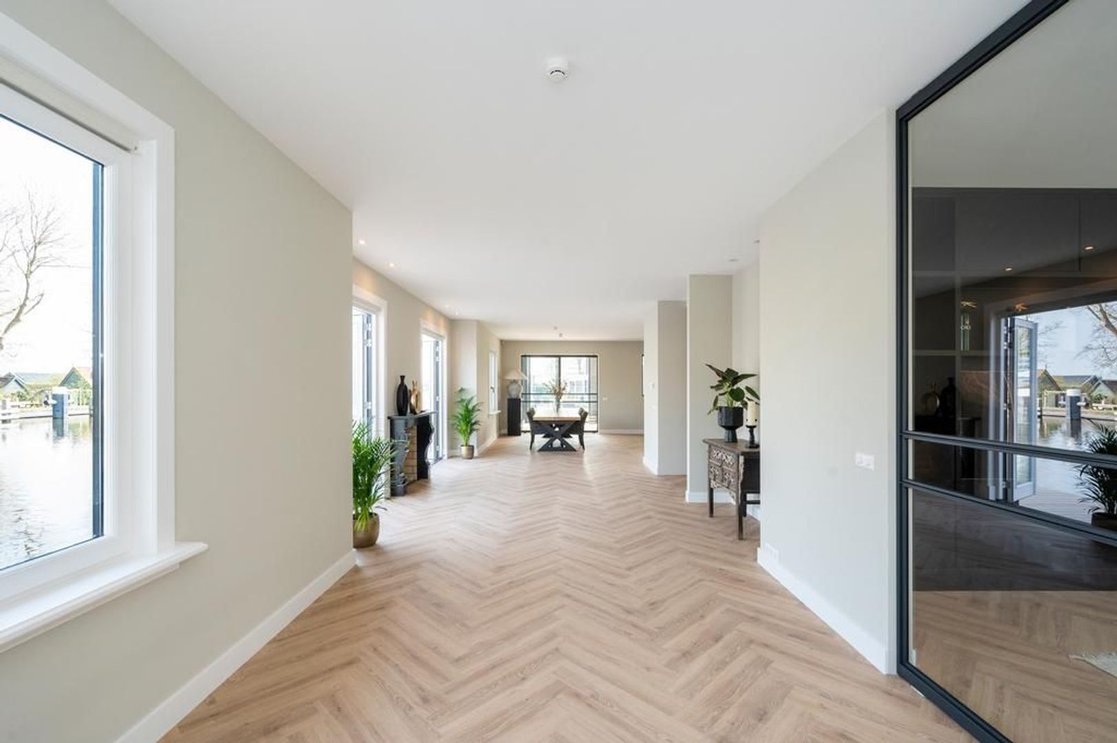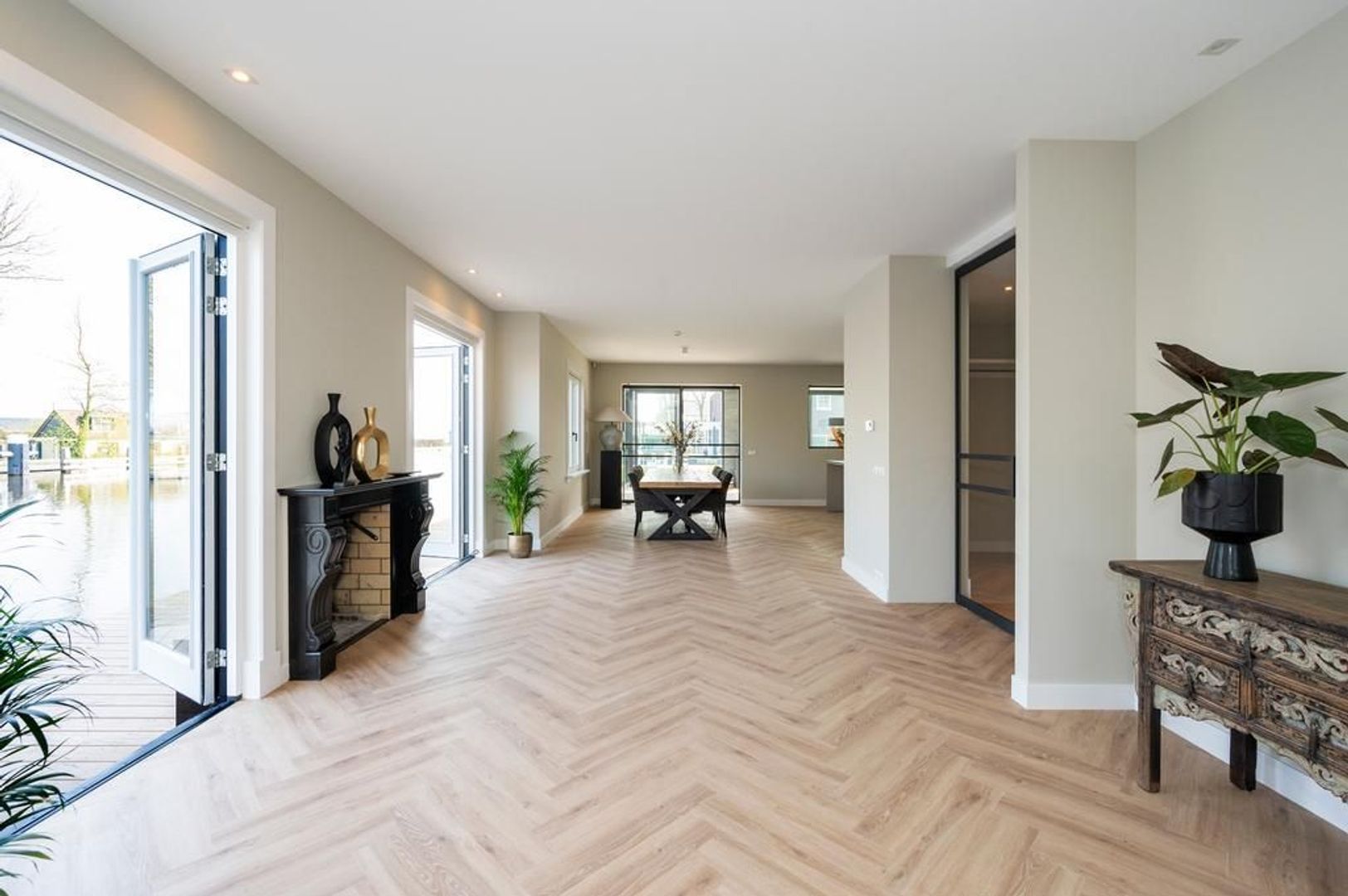 Bij binnenkomst in de woonkamer wordt u meteen verrast door de ultieme ligging aan het water en de speelse indeling welke ruimte biedt aan diverse leefhoeken met elk hun eigen charme. Een grote schouw met stookplaats (gas) zorgt voor een verbindende sfeer.