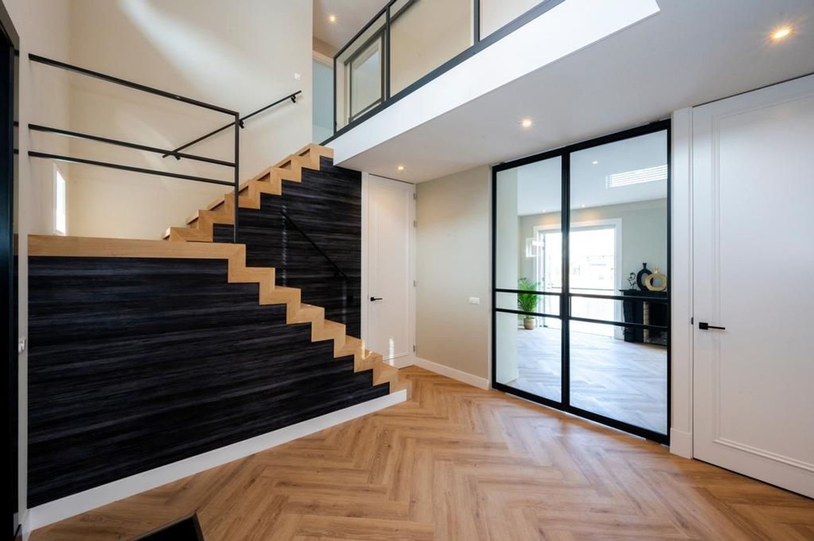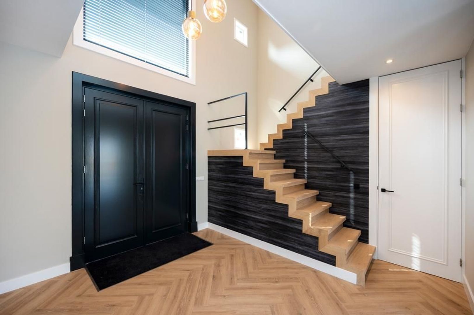 Magnifieke entree met vide en fraai trappenhuis met rechts het toilet en garderobe.