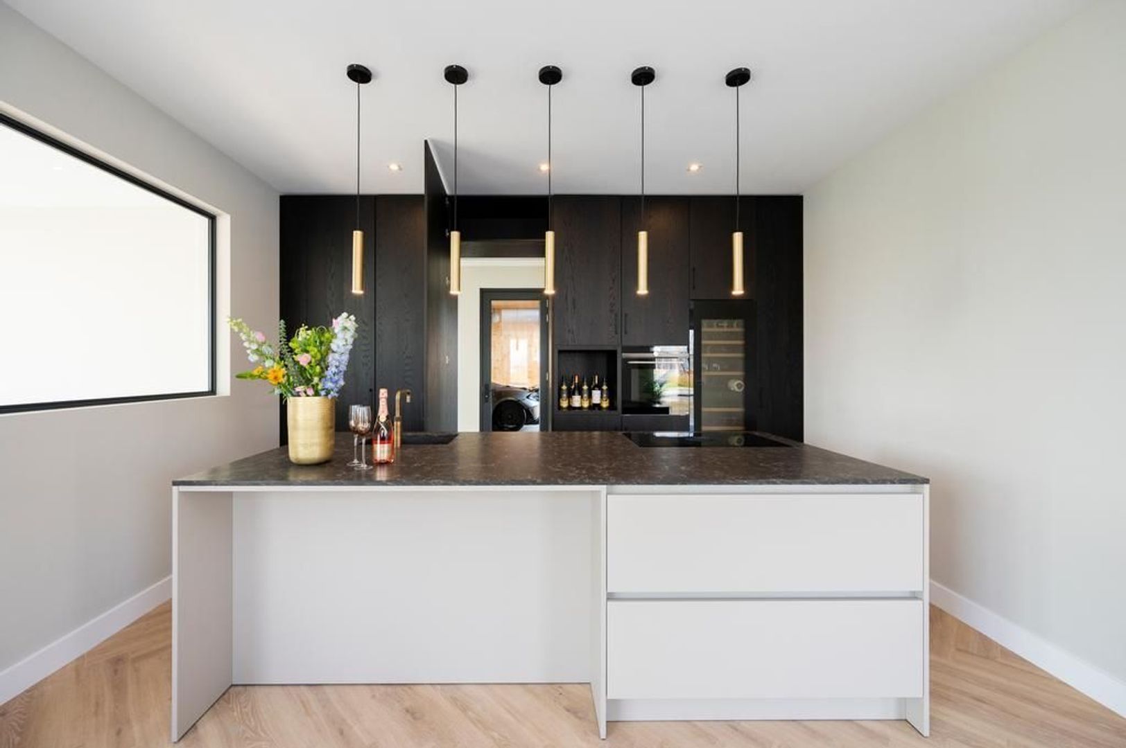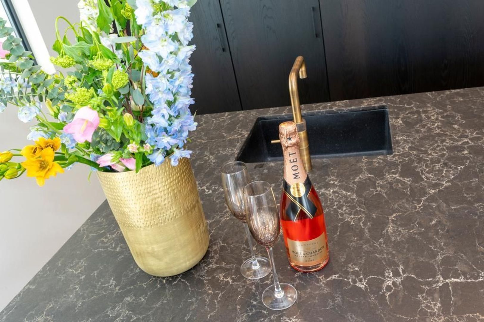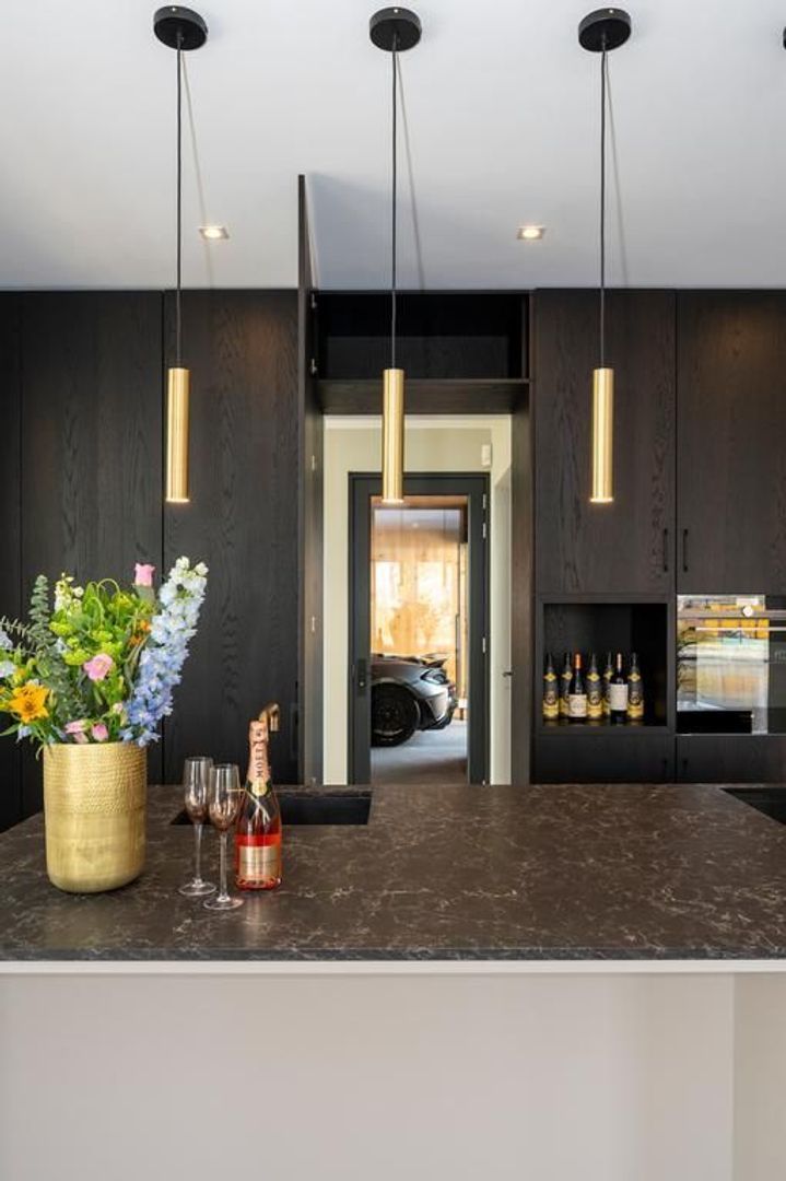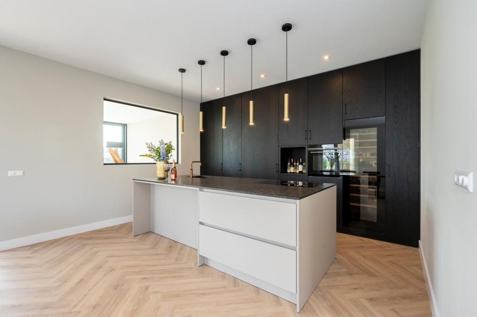 De luxe open keuken is een lust voor het oog en is uiteraard van alle gemakken voorzien tot aan een wijnklimaatkast aan toe. Het spoeleiland dient tevens als bar en is afgewerkt met een prachtig natuurstenen blad. Er is voldoende bergruimte met laden en kasten.